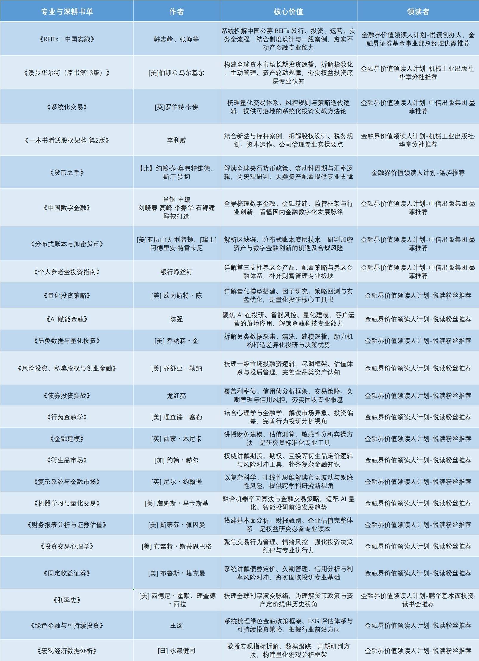 专业能力,是金融人穿越周期的核心底气。本维度精准对接投资、研究、风控、科技等专业岗位需求,重点覆盖量化金融、ESG 整合投资、AI 应用、另类数据等前沿领域,兼顾体系化知识构建与实战方法论落地。同时,特意引入物理学、复杂科学等跨学科经典,为金融研究注入新视角、新思维,打造个人与团队持续提升专业竞争力的“能量补给站”,让专业能力成为核心竞争力。