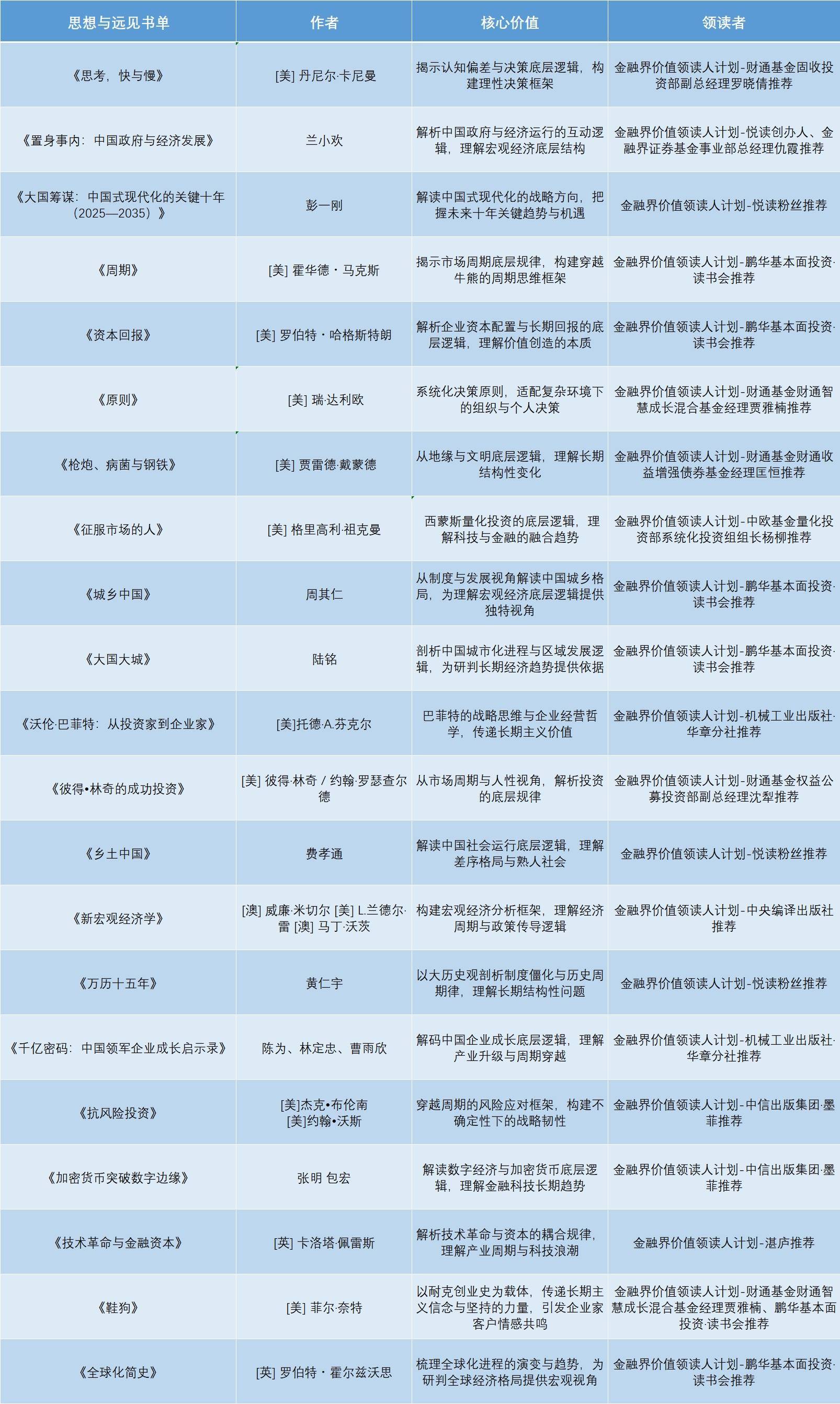 为让这份“知识价值矩阵”真正走进行业、深入人心,金融界同步发起 #价值领读人计划#,以上书单由鹏华基金、中欧基金、财通基金、东方红资产管理、中信出版集团·墨菲、机械工业出版社·华章分社、电子工业出版社、湛庐、中央编译出版社、人民邮电出版社等机构推荐,他们以读书心得、视频寄语的形式,分享阅读感悟,诠释阅读如何为行业创造价值、为个人赋能成长。